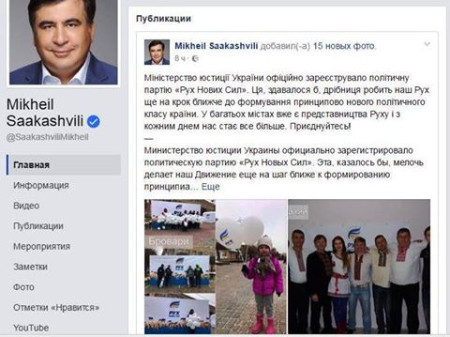 "Михеїл Саакашвілі пише: "Міністерство юстиції України офіційно зареєструвало політичну партію «Рух Нових Сил». Ця, здавалося б, дрібниця робить наш Рух ще на крок ближче до формування принципово нового політичного класу країни".