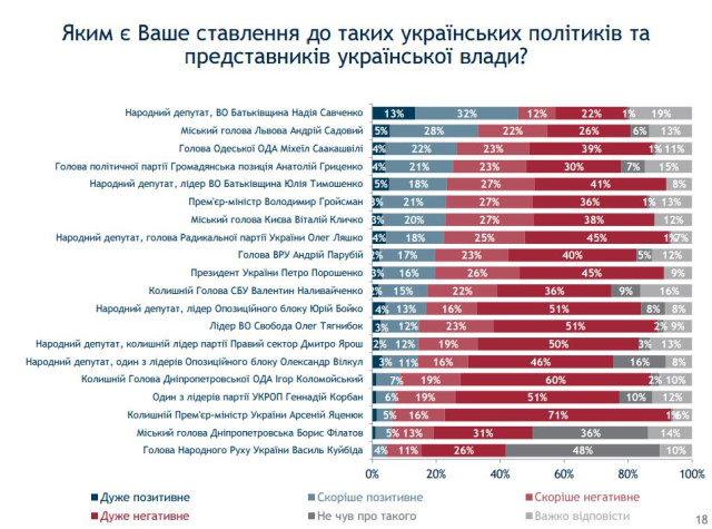 Варто відзначити, що в лютому-березні 2016-го року аналогічне опитування того ж "Рейтингу" показувало значно позитивніше ставлення до Саакашвілі: тоді його дуже позитивно оцінювали 6%, більше позитивно – 28 %, що дає загальний рівень підтримки в 34 %. Іншими словами, за три місяці популярність Саакашвілі скоротилася майже на чверть.Втім, поки що Саакашвілі залишається однією з найбільш популярних фігур на політичній арені. Обійшли його в рейтингу симпатій лише Надія Савченко, яку позитивно або більше позитивно оцінюють 45 % опитаних, а також мер Львова Садовий, хорошої думки про якого дотримуються 33 % опитаних. Що ж до лідерів держави, то їм особливо похвалитися нічим: до Порошенка добре ставляться 19 % опитаних, а погано – 71% Стільки ж прихильників у спікера ВР Парубія, але супротивників у того менше - лише 63 %.