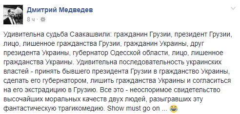 «Дивна доля Саакашвілі: громадянин Грузії, президент Грузії, особа, позбавлена громадянства Грузії, громадянин України, друг президента України, губернатор Одеської області, особа, позбавлена громадянства України ... Show must go on», - написав Медведєв.