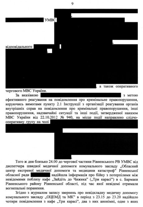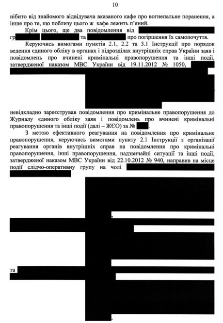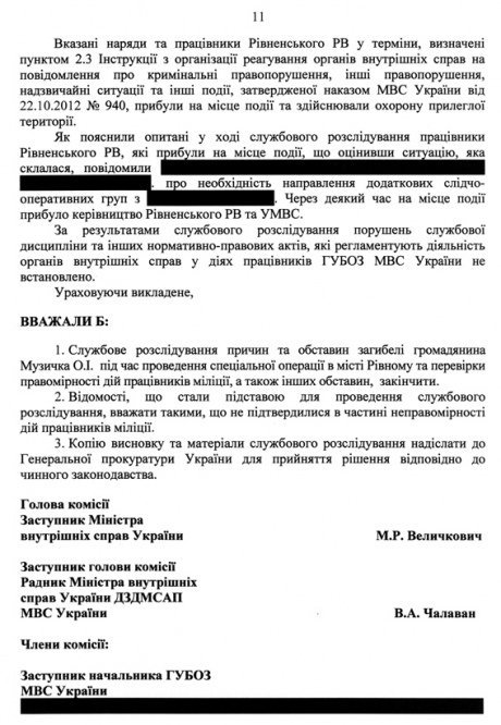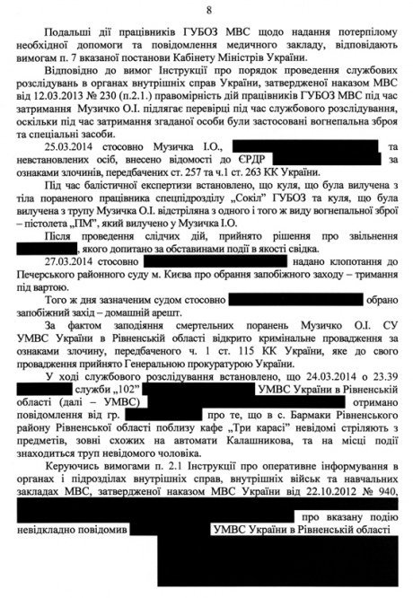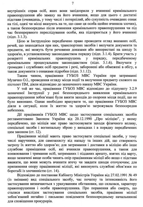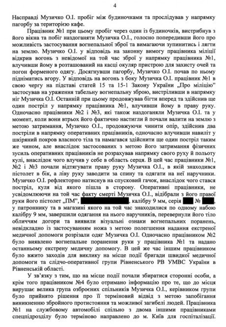 "Оперативні працівники, не усвідомлюючи на той час факту смерті Музичка, відібрали з його правої руки пістолет ПМ калібру 9 мм…, завершили одягання наручників, перевернули його тіло обличчям догори та виявили ознаки вогнепальних поранень, невідкладно із застосуванням ножа з метою полегшення надання екстреної меддопомоги розрізали одяг Музичка", - йдеться у документі.