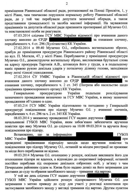 Проти Музичка було відкрито провадження за статтями про хуліганство та про погрози чи насильство щодо працівника правоохоронного органа, оскільки 25 лютого він вдерся зі зброєю до Рівненської облради, порушивши її роботу, а 27 лютого – увірвався до рівненської прокуратури й застосував силу до прокурора Таргонія.