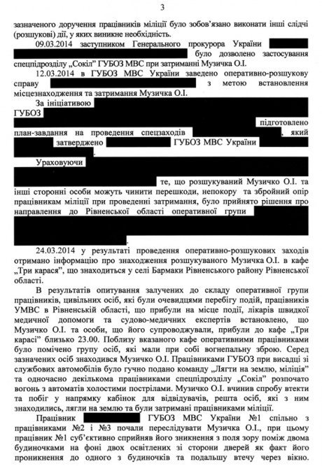 Згідно з документом, працівники ГУБОЗ крикнули "Лягти на землю, міліція" та зробили декілька холостих пострілів із автоматів, та Музичко почав тікати. Його наздоганяли, закликаючи зупинитися й лягти на землю, попередили про можливе відкриття вогню, однак розшукуваний почав відстрілюватися, поранив одного з силовиків.