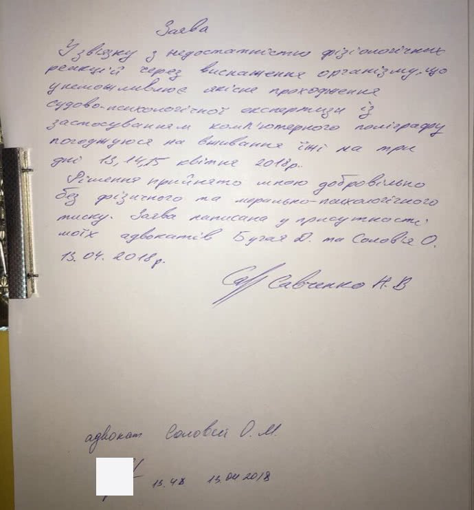 13 квітня допит на поліграфі Савченко був призупинений через те, що арештована голодує, а тому провести процедуру коректно неможливо.Нагадаємо, Верховна Рада позбавила Савченко депутатської недоторканності та надала дозвіл на її затримання й арешт. Надію Савченко 23 березня суд арештував на 59 днів.