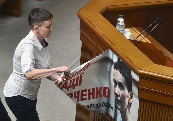Попросивши вибачення у матері Вадима Пугачова (до його вбивства на Луганщині причетні російські диверсанти Олександр Александров і Євген Єрофєєв, на яких обміняли Савченко – Авт.), вона, як і анонсував Сегодня.ua, зірвала з трибуни плакат з її зображенням: "Я знімаю свій портрет з трибуни і заміняю його обличчями хлопців, які будуть дивитися вам в очі, які сидять в тилу ворога, борються за нашу Україну, щоб кожен раз, виступаючи за трибуною, ви дивилися в їхні очі і розуміли, що не маєте права не витягнути останнього з них".Тепер на трибуні висить плакат із написом "Волю в'язням Кремля" з фотографіями трьох десятків громадян України, які потрапили до в'язниці в Росії і Криму: Олега Сенцова, Олексія Чірного, Олександра Кольченка, Геннадія Афанасьєва, і інших.
