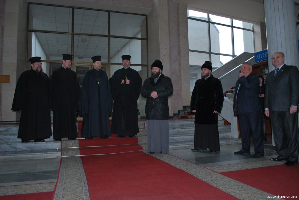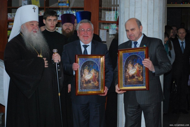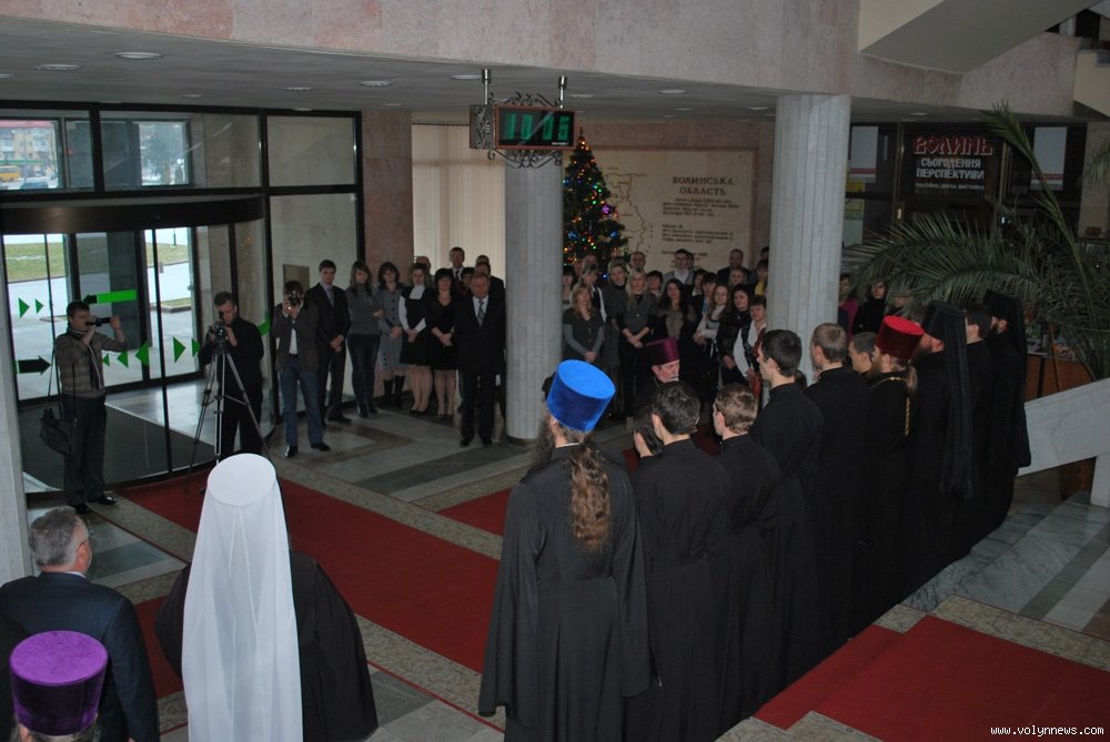 До «білого дому» завітали священнослужителі-колядники на чолі з керуючим Волинською єпархією УПЦ митрополитом Луцьким і Волинським Ніфонтом.