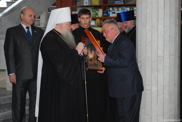 Він подарував губернатору Борисові Клімчуку та голові облради Володимиру Войтовичу образи Ісуса Христа та пожартував, назвавши регіональне управління СБУ та обласне управління лісового і мисливського господарства – «легенями» краю, а обласну адміністрацію та раду - «серцем».