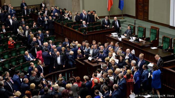 У ніч на 17 грудня протестувальники у Варшаві заблокували виходи з парламенту Польщі після заяви опозиції про те, що правляча партія перенесла голосування за бюджет за межі основної палати Сейму.