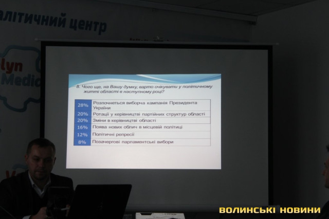Експерти Центру політичного аналізу та виборчого консалтингу опитали 25 експертів - політичних аналітиків, журналістів, викладачів вищих навчальних закладів, громадських діячів та державних службовців. Як повідомив експерт Центру політичного аналізу та виборчого консалтингу Володимир Павлюк, згідно з результатами опитування більшість (28%) прогнозує початок справжньої виборчої кампанії Президента України у 2014 році, 20% вважають, що відбудуться ротації у керівництві партійних структур області, 20% прогнозують зміни у керівництві області, 16% - появу нових облич у місцевій політиці, 12% - політичні репресії та 8% - позачергові парламентські вибори. Торік більшість експертів (20%) прогнозувала зміни в обласних партійних структурах на Волині, що і відбулося.