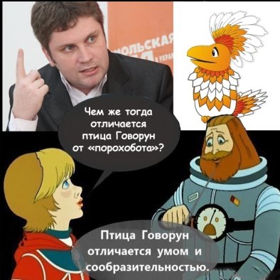«Птах Говорун (персонаж мультика «Таємниця третьої планети»), як відомо, відрізнялася розумом і кмітливістю. Тоді як штатний «порохобот» на ім'я Денис П’ятигорець, судячи з кількості постів - відрізняється саме своєю балакучістю, тоді як розумом і кмітливістю, м'яко кажучи, похвалитись не може».