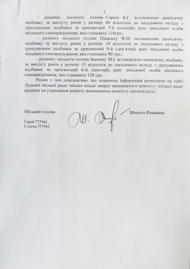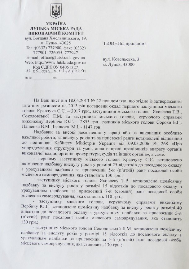 Однак працівники видання «Під прицілом» знайшли на офіційному сайті Луцької міськради іншу інформацію про надбавки до зарплатні посадовців. Зокрема у таблиці детально розписано усі надбавки, які отримує мер, його заступники та радники.