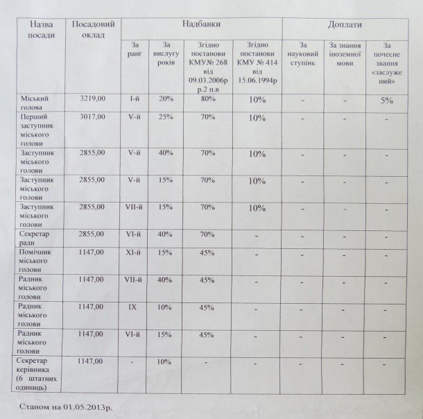 У документі за підписом Миколи Романюка зазначено, посадовий оклад першого заступника міського голови Святослава Кравчука становить 3017 гривень.