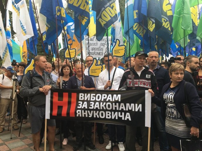 Люди тримають прапори різних політичних сил та об’єднань. У руках у них плакати з написами: "Ні виборам за законами Януковича", "Ні корупційній виборчій системі" тощо.