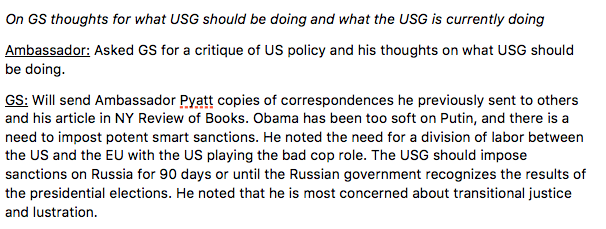 «Ця зустріч була б хорошим знаком, що в Україні немає цих жахливих націоналістів», - наголошується в документі.Також, згідно з цим документом, планувалися зустрічі з Юлією Тимошенко, Віталієм Кличком, Петром Порошенко і Сергієм Тігіпком - «депутатом і потенційним кандидатом на президентські позиції від Партії регіонів, він дуже демократичний», йдеться про нього в документі.