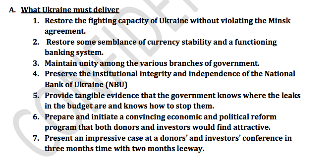 Представити вражаючі результати на конференції донорів та інвесторів.Консультувати українську владу за першим пунктом повинні були колишній генерал Уеслі Кларк, польський генерал Скрипчак і кілька експертів Атлантичної ради. Вони повинні були дати рекомендації президенту України Петру Порошенко щодо того, як відновити боєздатність України, не порушуючи при цьому Мінських угод.