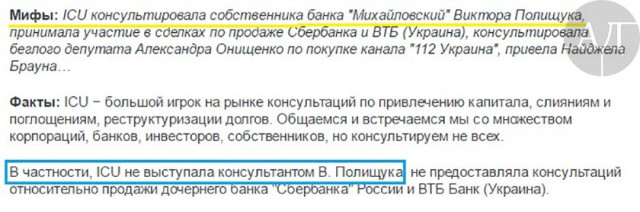 Співвласник компанії «Інвестиційний капітал Україна» (ICU) Макар Пасенюк в колонці на сайті Цензор пише, що його компанія «не виступала консультантом Віктора Поліщука» - власника банку «Михайлівський». Проте Пасенюк лукавить. В офіційній презентації «Михайлівський» публічно рекламував своє «успішне партнерство» з ICU як «інвестиційною та консалтингової» компанією, йдеться на сайті Олександра Дубінського.