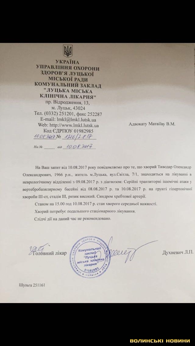 Я вважаю, що краще його госпіталізувати в медустанову», - розповів фельдшер Рознюк.На адвокатський запит Матвіїва Луцька міська клінічна лікарня за підписом головного лікаря Лариси Духневич надала медичний висновок.
