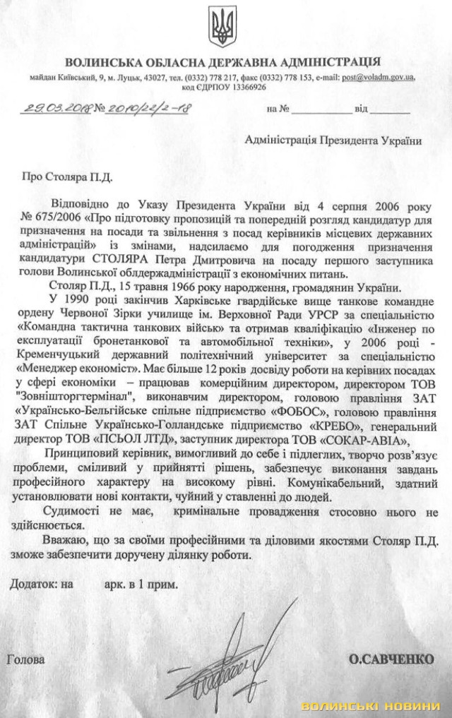 Наразі відомо, що новопризначений очільник Волинської ОДА Олександр Савченко сьогодні вніс подання на призначення Петра Столяра своїм першим заступником з економічних питань.