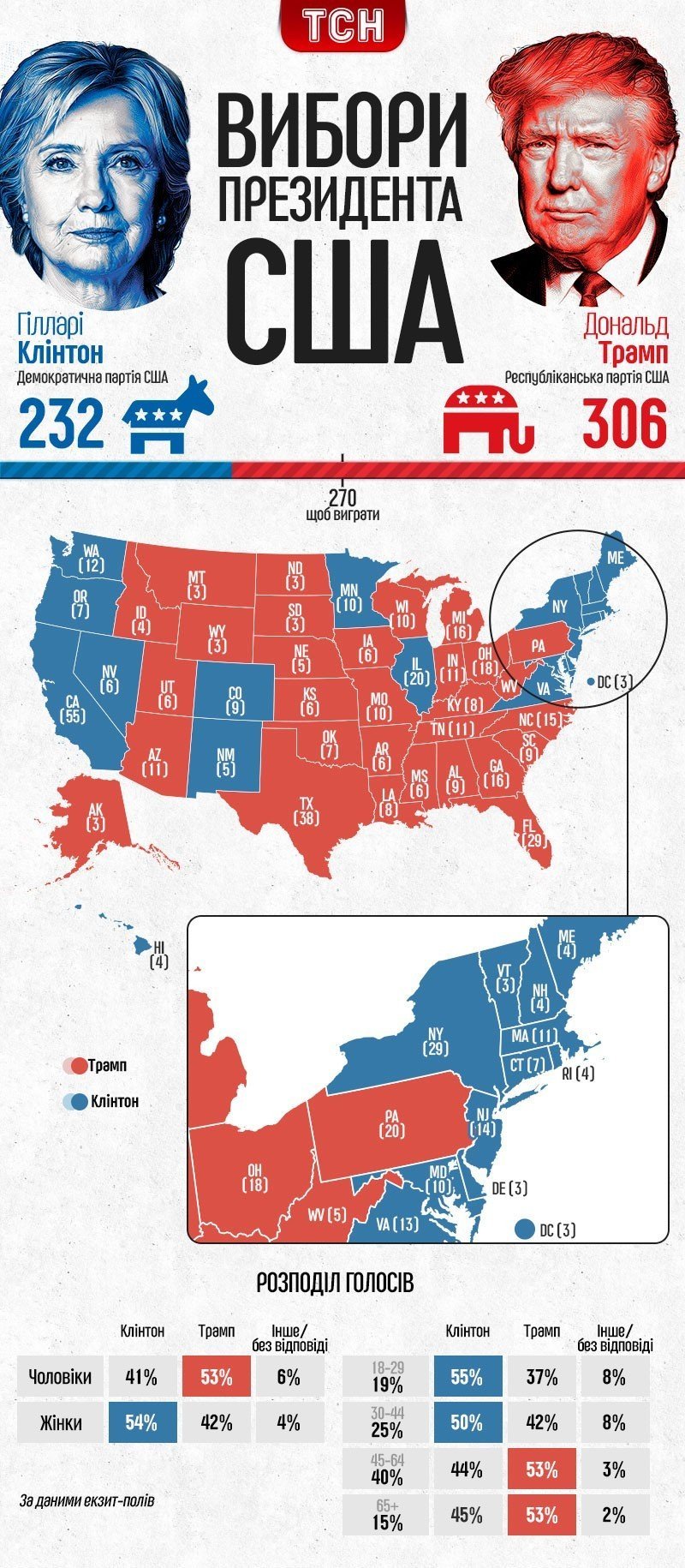 Незважаючи на впевнену перемогу республіканця Дональда Трампа на виборах у США, з'явилися остаточні результати екзит-полів по штатах та інформація про розподіл голосів.