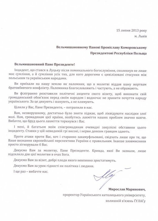 Проректор Українського католицького університету Мирослав Маринович звернувся із відкритим листом до президента Польщі Броніслава Коморовського. У посланні він подякував главі польської держави за візит та перепросив за "яєчний інцидент".