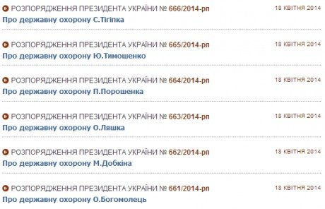 Так, виконувач обов'язків президента наказав охороняти Петра Порошенка, Юлію Тимошенко, Сергія Тігіпка, Олега Ляшка, Михайла Добкіна та Ольгу Богомолець.