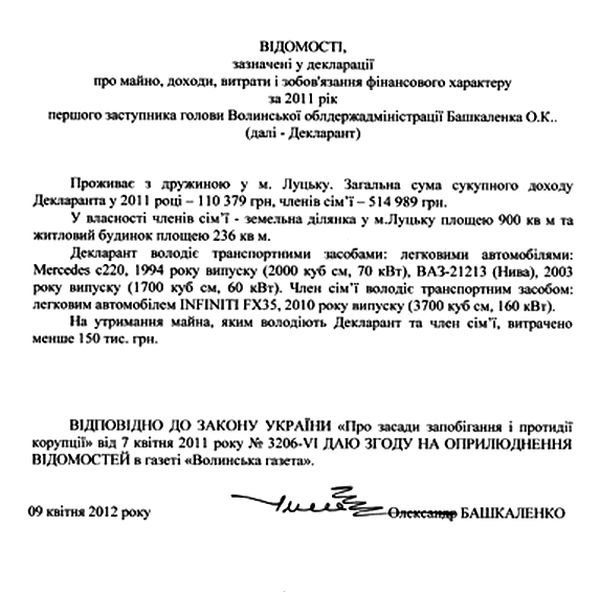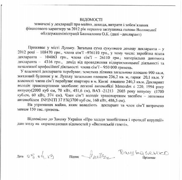 Підпис, який стоїть навпроти прізвище екс-головного регіонала Волині, збігається з підписом, залишеним Башкаленком на відомостях з декларації про доходи, опублікованих у 2011 році у “Волинській газеті”.