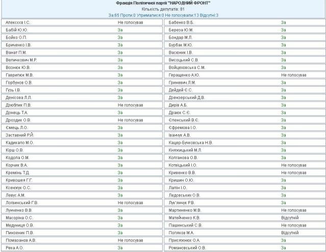 Так, згідно з даними Верховної Ради про поіменне голосування, за проект постанови про звільнення Шевченка не голосували 13 депутатів від «Народного фронту», три «фронтовика» відсутні на засіданні ВР.