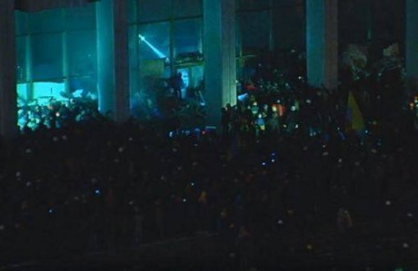 Активісти скандують: "Виходьте!", "Київ, вставай!" та "Банду геть!". Протестувальники також розбили вікна та запустили кілька піротехнічних ракет, які вибухнули всередині. З будівлі штурмовиків поливають водою.