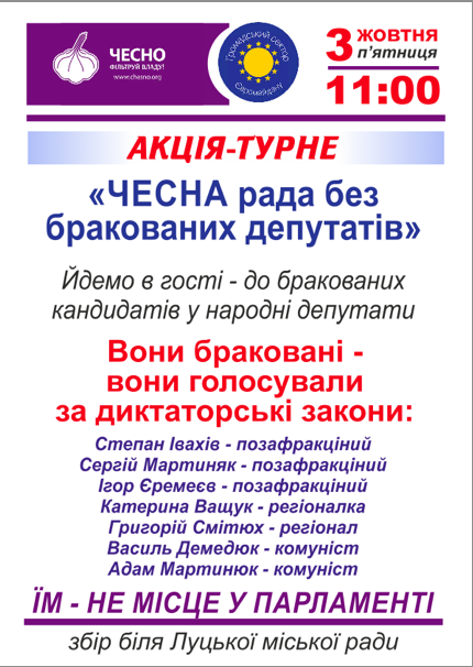 Громадський рух «ЧЕСНО» спільно із Громадським сектором Євромайдану організовує акцію-турне «ЧЕСНА рада без бракованих депутатів», - повідомили активісти.
