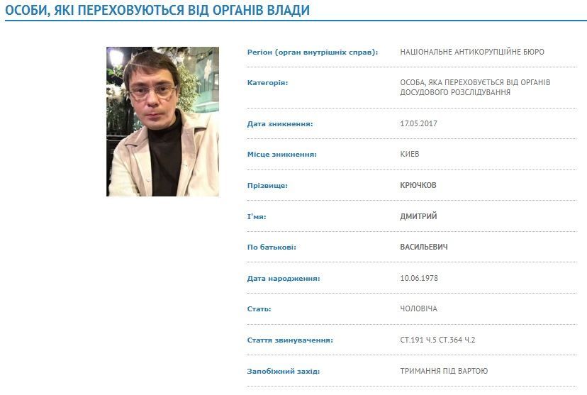 Нагадаємо, Крючков фігурує у справі привласнення 346 млн грн "Запоріжжяобленерго", у якому понад 60% акцій належить державі. У липні 2016 року, за словами директора НАБУ Артема Ситника, Крючкова оголосили в розшук. На сайті МВС вказано, що він зник 17 травня 2017-го.