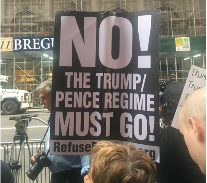 У Нью-Йорку сотні демонстрантів 14 серпня вийшли на акцію протесту до Trump Tower, аби виступити проти президента США Дональда Трампа в зв'язку з зіткненнями в штаті Вірджинія, в ході яких постраждало понад 30 осіб.