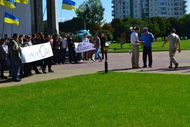 Група людей зібралася на площі з плакатами: «Борисе, в парламенті не сховаєшся!», «Сивина в бороду, а регіони у ребро».