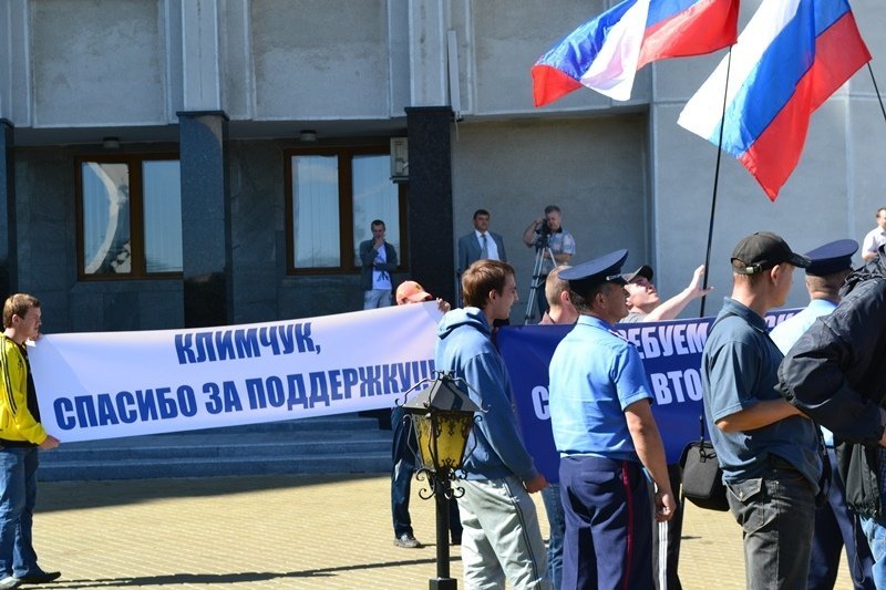Після цього між «опонентами» та «прихильниками» губернатора виникла словесна перепалка. Аби уникнути сутички, правоохоронці взяли у кільце пікетувальників із російськими триколорами. Коли «опоненти» губернатора не змогли прорвати кільце міліції, то «захисників» Клімчука закидали яйцями, після чого вони втекли.