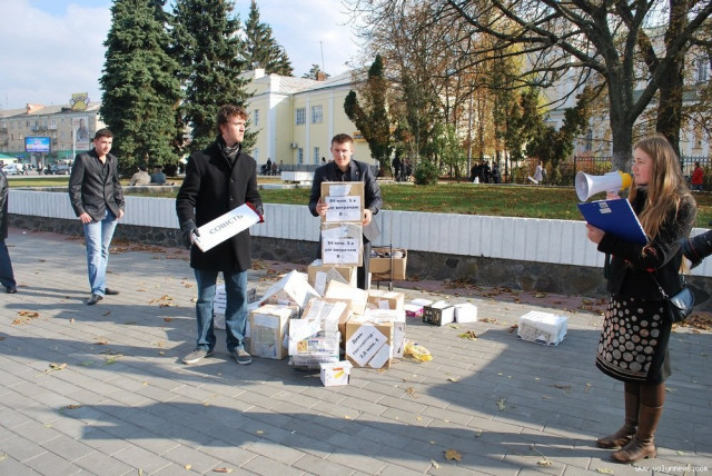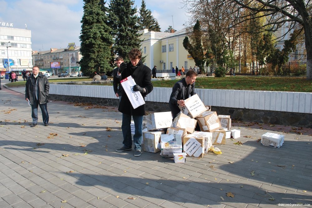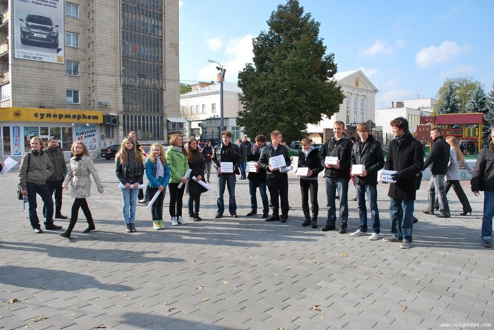 На Театральному майдані Луцька молоді люди шукали «совість Президента України». Це відбулося 25 жовтня під час флеш-мобу «Я проти!» в межах акції «Україна проти Януковича».