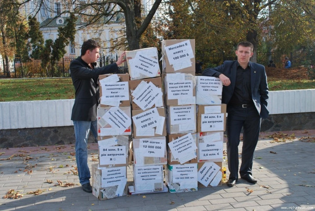 Учасники флеш-мобу порівнювали видатки на утримання Президента та пересічного українця, використовуючи візуальні засоби, статистичні дані. Зо два десятки молодих лучан стояли з табличками «20 гривень для студента на один день», «Гуртожиток: семеро в кімнаті, не рахуючи пса», «Зарплата 1500 грн. Як прожити?» тощо. Наскільки дорогим, на їх думку, є утримання Президента для українського народу, демонструвала «стіна» з коробок із написами «Мій робочий день коштує $ 230 000, крутіше тільки США і Росія», «Диво-гелікоптер – 2,6 млн євро», «VIP-вагон – 12 000 000 грн». Біля них розташувалася людина, яка грала роль Віктора Януковича.