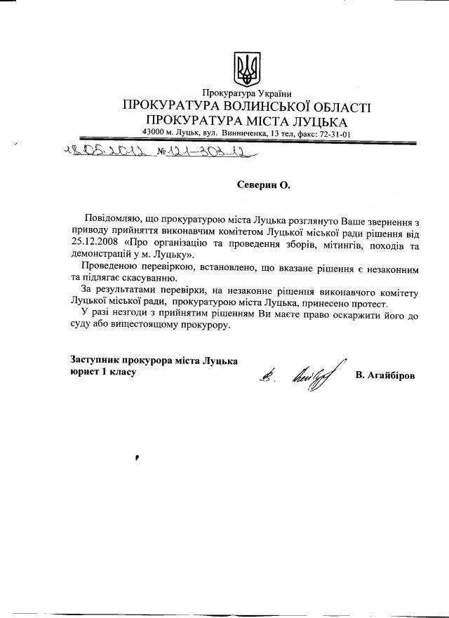 У відповіді за підписом заступника прокурора Луцька Валентина Агайбірова йдеться, що правоохоронці опротестували рішення виконкому, яке регулює порядок організації та проведення зборів, мітингів, походів та демонстрацій в обласному центрі Волині. «Проведеною перевіркою встановили, що вказане рішення є незаконним і підлягає скасуванню», - йдеться в документі.