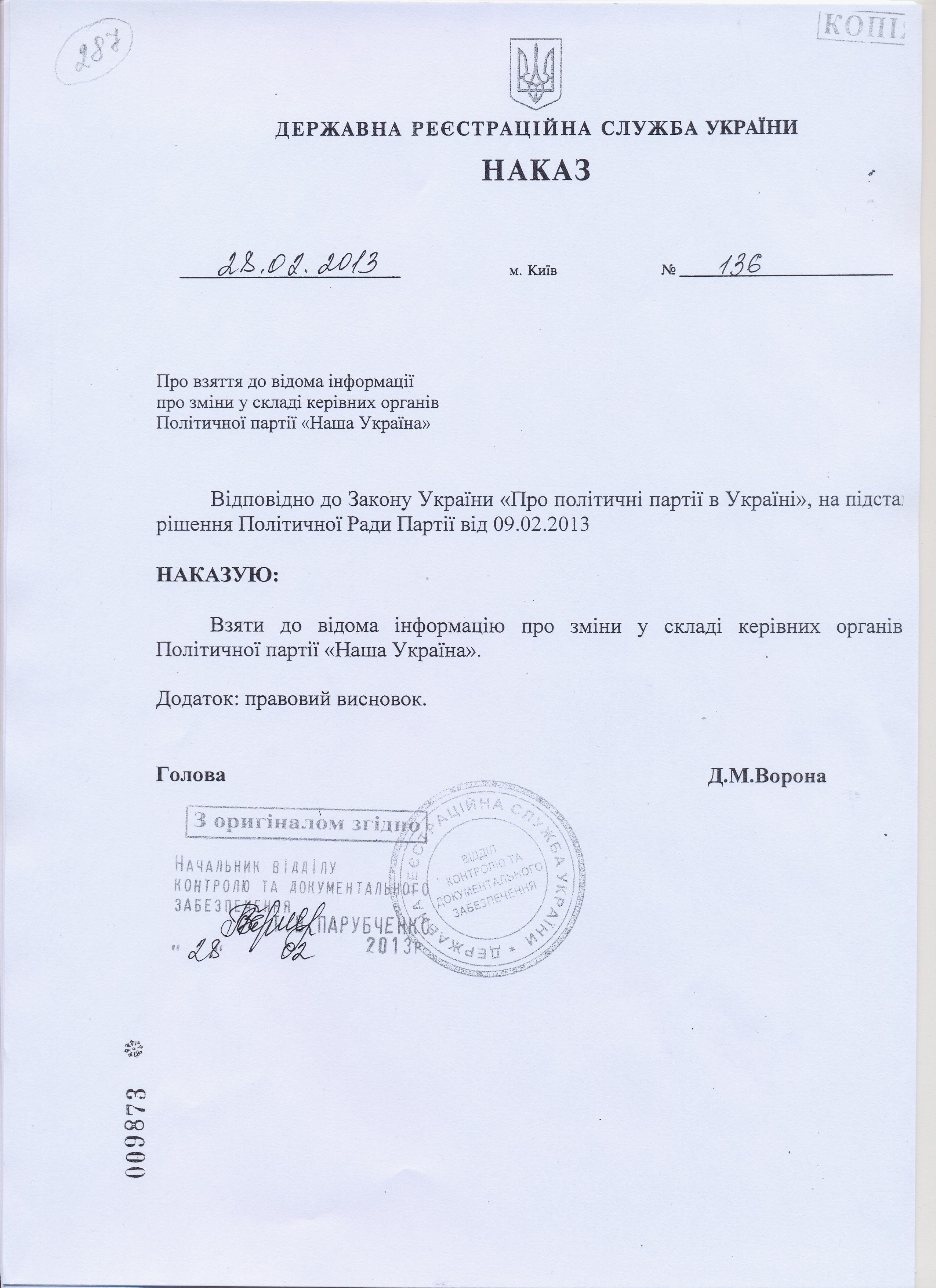 На підставі цього рішення Політради «Нашої України» відповідні зміни внесли в Єдиний державний реєстр юридичних осіб Міністерства юстиції України.