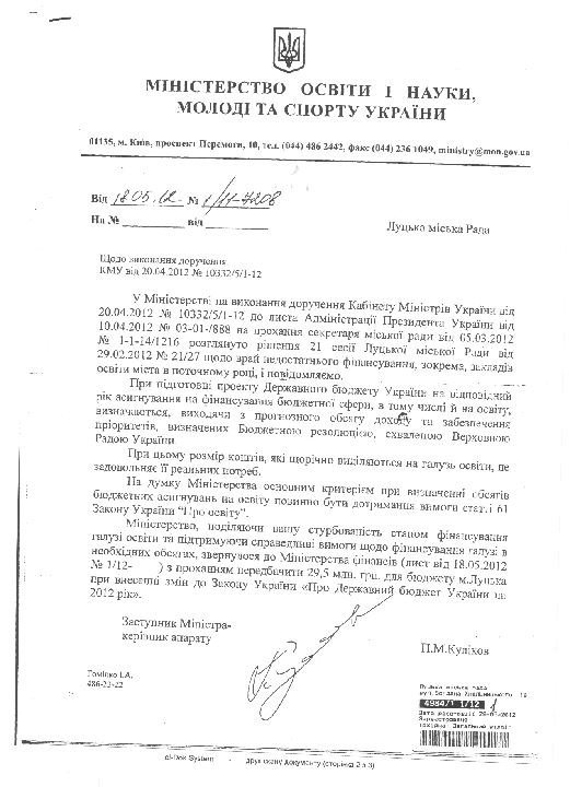 «Міністерство, поділяючи вашу стурбованість станом фінансування галузі освіти та підтримуючи справедливі вимоги щодо фінансування галузі в необхідних обсягах, звернулося до Міністерства фінансів з проханням передбачити 29,5 мільйона гривень для бюджету Луцька при внесенні змін до Закону України про «Державний бюджет України на 2012 рік», - заявили столичні чиновники.