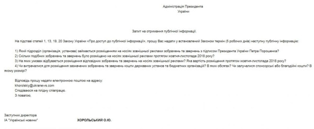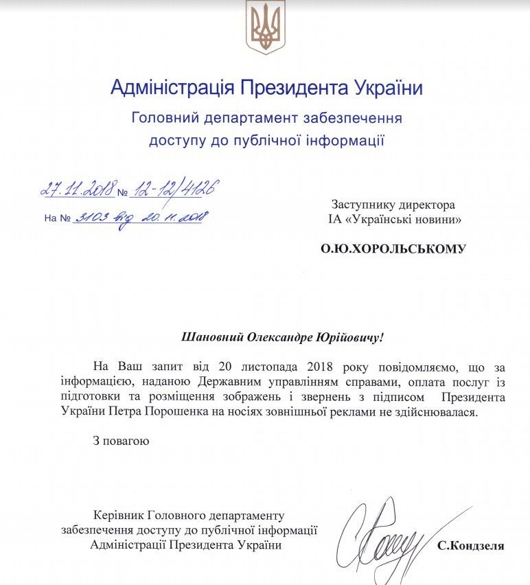 Зокрема, Українські Новини цікавилися у президентській канцелярії, яка організація чи підрозділ займається розміщенням реклами з підписом президента, на яких умовах поширюється ця реклама, а також яка вартість кампанії і чи витрачалися на неї бюджетні кошти.«За інформацією, наданою Державним управлінням справами, оплата послуг із підготовки та розміщення зображень і звернень з підписом президента України Петра Порошенка на носіях зовнішньої реклами не здійснювалася», — йдеться у відповіді АП.Жодної іншої інформації щодо організації, яка займається розміщенням реклами, а також умов цих розміщень, відповідь АП не містить.