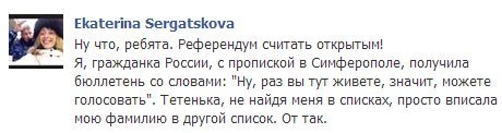 "Референдум вважати відкритим! Я, громадянка Росії, з пропискою в Сімферополі, отримала бюлетень зі словами: "Ну, раз Ви тут живете, тож, можете голосувати" , - написала вона.
