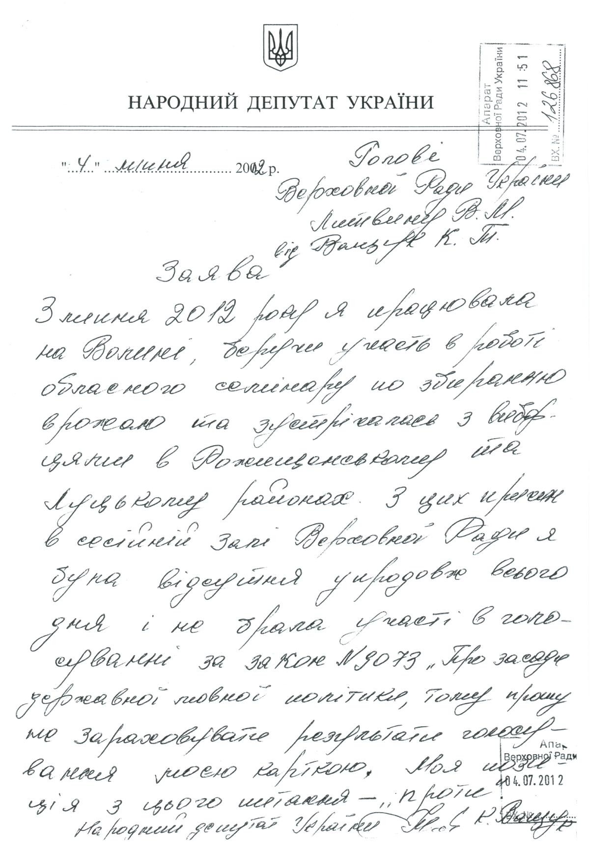 Те що голосували її карткою Ващук не заперечує, але вона в листі дала чітку відповідь, що вона "проти" цього закону.