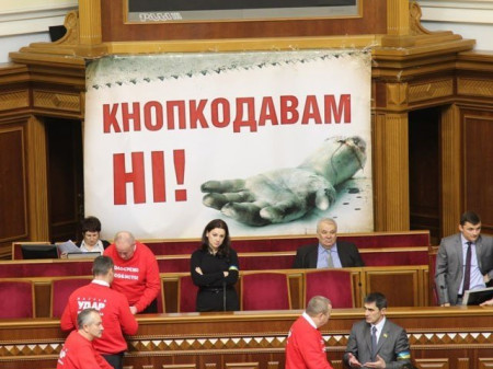У президії та на ложі уряду висять плакати з написами: «Рада гниє з Рибака», «Кнопкодави — геть із Ради!», «Кнопкодавам — ні!», «Депутате! Ходи на роботу! Голосуй особисто!» тощо.