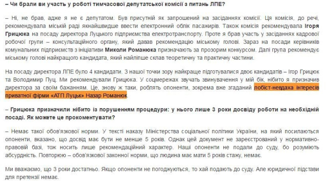Цю думку, вочевидь, поділяють не лише автор петиції і сотні лучан, але й інші чиновники. Зокрема, заступник луцького міського голови Сергій Григоренко в інтерв’ю «Волинському агентству розслідувань» також заявив про відкрите відстоювання бізнес-інтересів Романюком на користь АТП. Та, описуючи інцидент з призначенням директора ЛПЕ, назвав Назара Романюка «лобістом-невдахою інтересів приватної фірми «АТП Луцьк».Замість P.S.