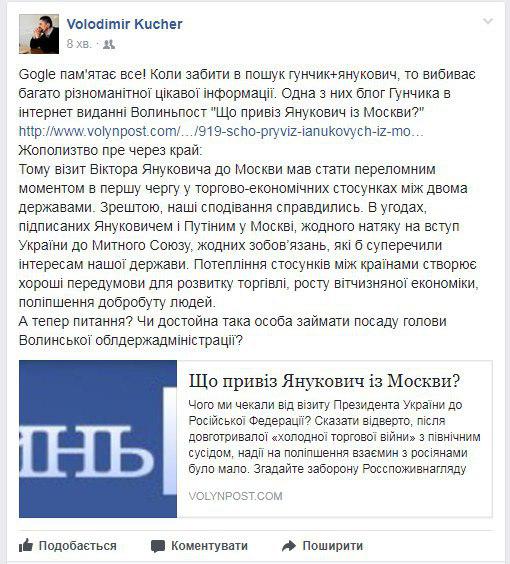«А тепер питання. Чи достойна така особа займати посаду голови Волинської облдержадміністрації?» - зазначає депутат.Зауважимо, що стаття з аналогічним змістом під назвою «Тепер ми зможемо стабілізувати ситуацію» вийшла у газеті «Волинь» 21 грудня 2013 року - вже після силової спроби розігнати Майдан, коли «Беркут» жорстоко побив молодь, яка протестувала проти входження до Митного Союзу і відмови від євроінтеграційного курсу.Проте минуло кілька років, і риторика голови ОДА різко змінилася у протилежному напрямку.