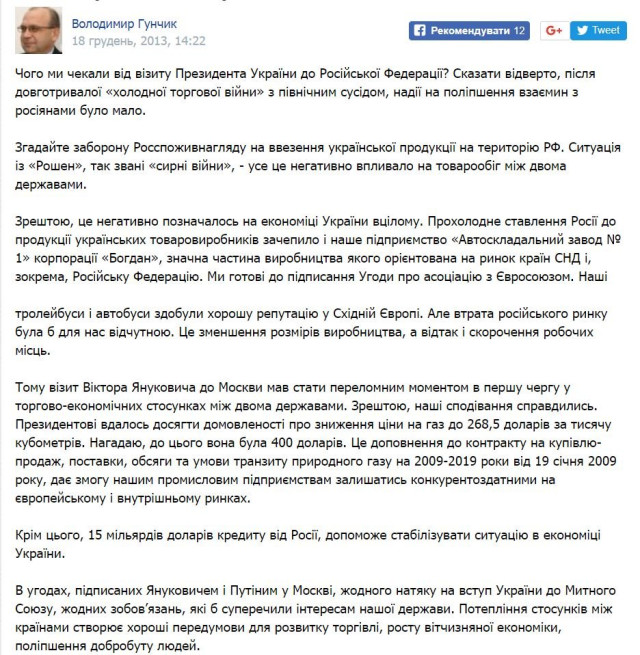 Так, у блозі «Що привіз Янукович із Москви?», опублікованому в інтернет-виданні ВолиньPost 18 грудня 2013 року, Володимир Гунчик писав: «Тому візит Віктора Януковича до Москви мав стати переломним моментом в першу чергу у торгово-економічних стосунках між двома державами. Зрештою, наші сподівання справдились. В угодах, підписаних Януковичем і Путіним у Москві, жодного натяку на вступ України до Митного Союзу, жодних зобов’язань, які б суперечили інтересам нашої держави. Потепління стосунків між країнами створює хороші передумови для розвитку торгівлі, росту вітчизняної економіки, поліпшення добробуту людей».