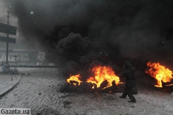 Біля барикад демонстрантів на вулиці Грушевського перед кордоном працівників спецпідрозділу міліції перебуває кілька сотень людей, які гріються у багать.