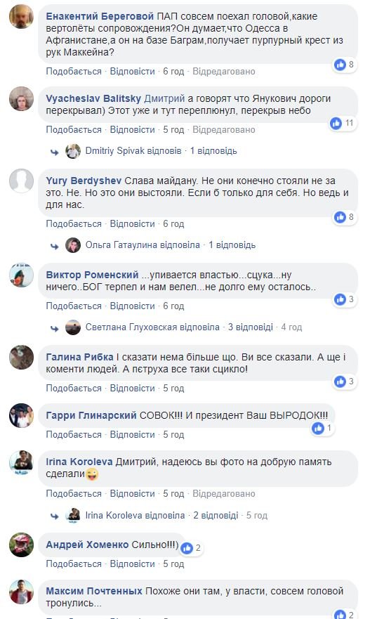 Аби не заважати проводам Петра Порошенка з аеропорту в Одесі, літак з пасажирами, які летіли з Києва в Одесу, майже годину змусили кружляти над летовищем. Порошенка проводжали чотири військові вертольоти супроводу та безліч озброєних охоронців. «Напевне, відчуває, як його «любить» народ. Перевершив навіть Януковича», - пишуть в соцмережах обурені користувачі.