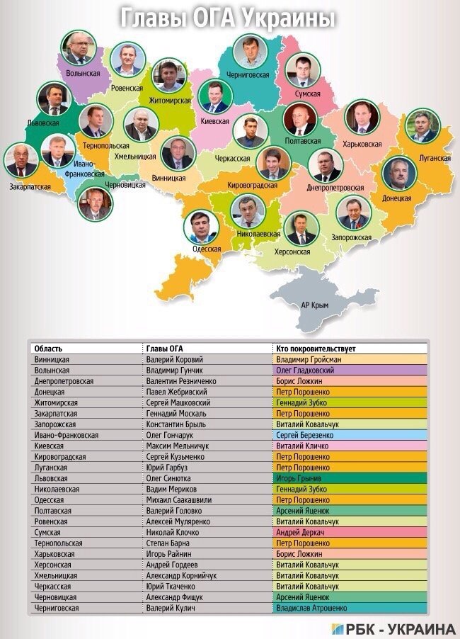 РБК-Україна оприлюднило картографічну схему “покровителів” усіх областей держави. Згідно з їх дослідженням, Волинською областю керує сам президент Порошенко. Звичайно, не особисто, а під пильним оком голови обласної державної адміністрації, його однопартійця Володимира Гунчика, та й то - за посередництвом куратора, так би мовити, одного з правиць Порошенка Олега Гладковського.