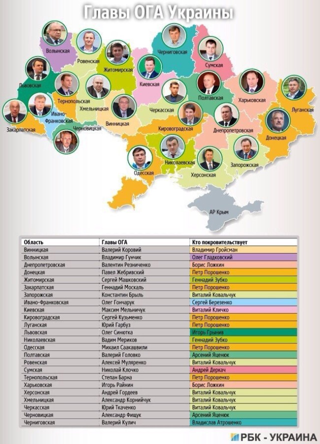 Так, на посади голів ОДА підбирали людей Віталій Ковальчук, Сергій Березенко, Борис Ложкін, Олег Гладковський, Давид Жванія та Ігор Гринів. Кожен з них займався кількома областями на дострокових парламентських виборах і в якості куратора пропонував президенту кандидатів на їх керівництво.