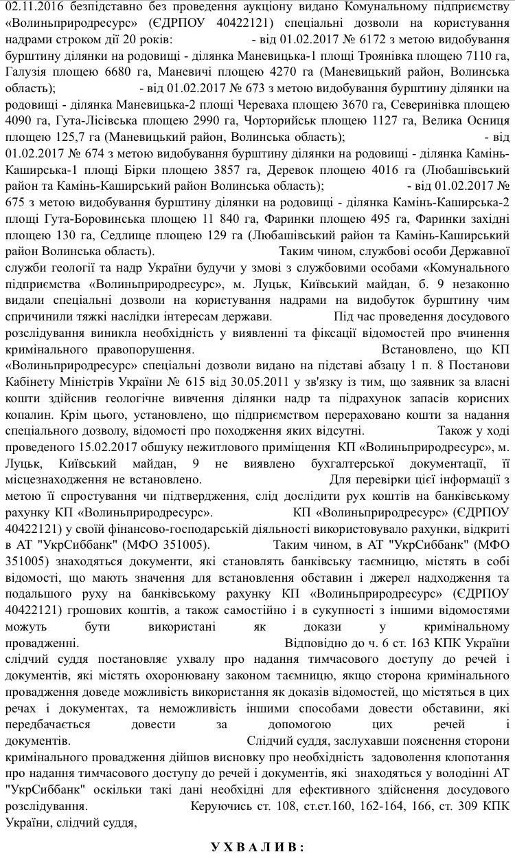 Печерський районний суд міста Києва видав ухвалу про тимчасовий доступ до документів Комунального підприємства «Волиньприродресурс» з можливістю вилучення їх копій. Безпосередньо це стосується документів щодо відкриття та обслуговування рахунків підприємства у банківських (Укрексимбанк, Укрсиббанк, Приватбанк) та казначейських установах.