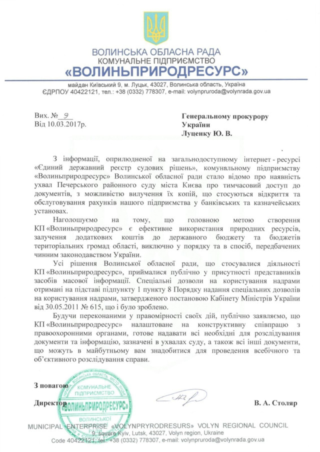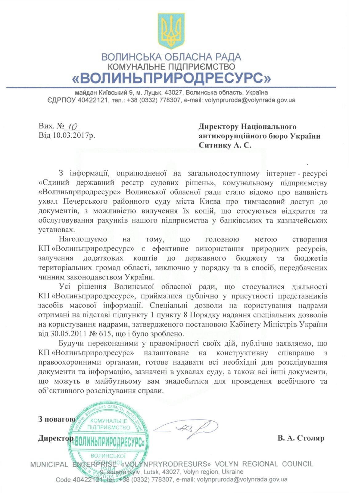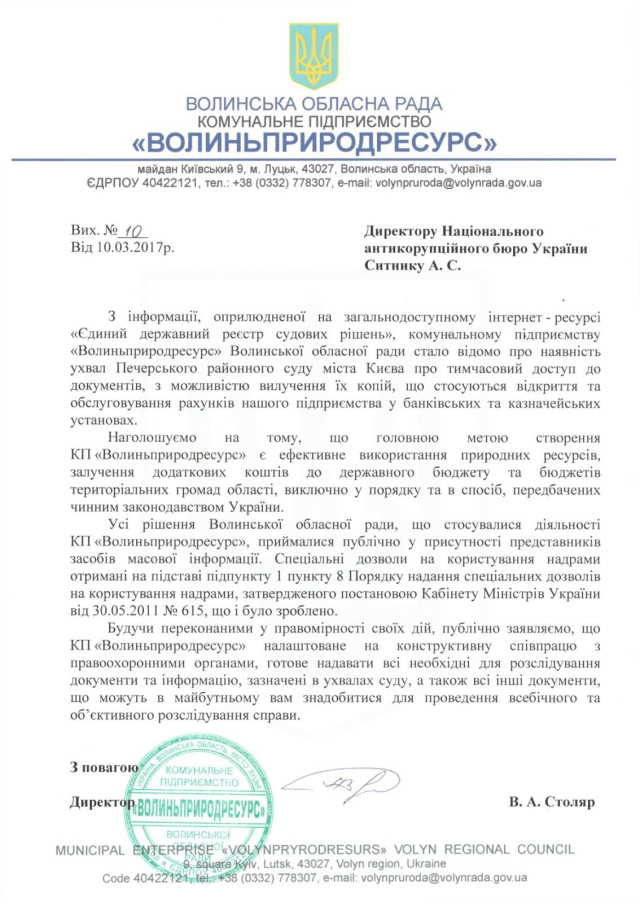 Будучи переконаними у правомірності своїх дій, публічно заявляємо, що КП «Волиньприродресурс» налаштоване на конструктивну співпрацю з правоохоронними органами, готове надавати всі необхідні для розслідування документи та інформацію, зазначені в ухвалах суду, а також всі інші документи, що можуть в майбутньому вам знадобитися для проведення всебічного та об’єктивного розслідування справи», - йдеться у відповіді «Волиньприродресурсу» на ухвалу Печерського суду.